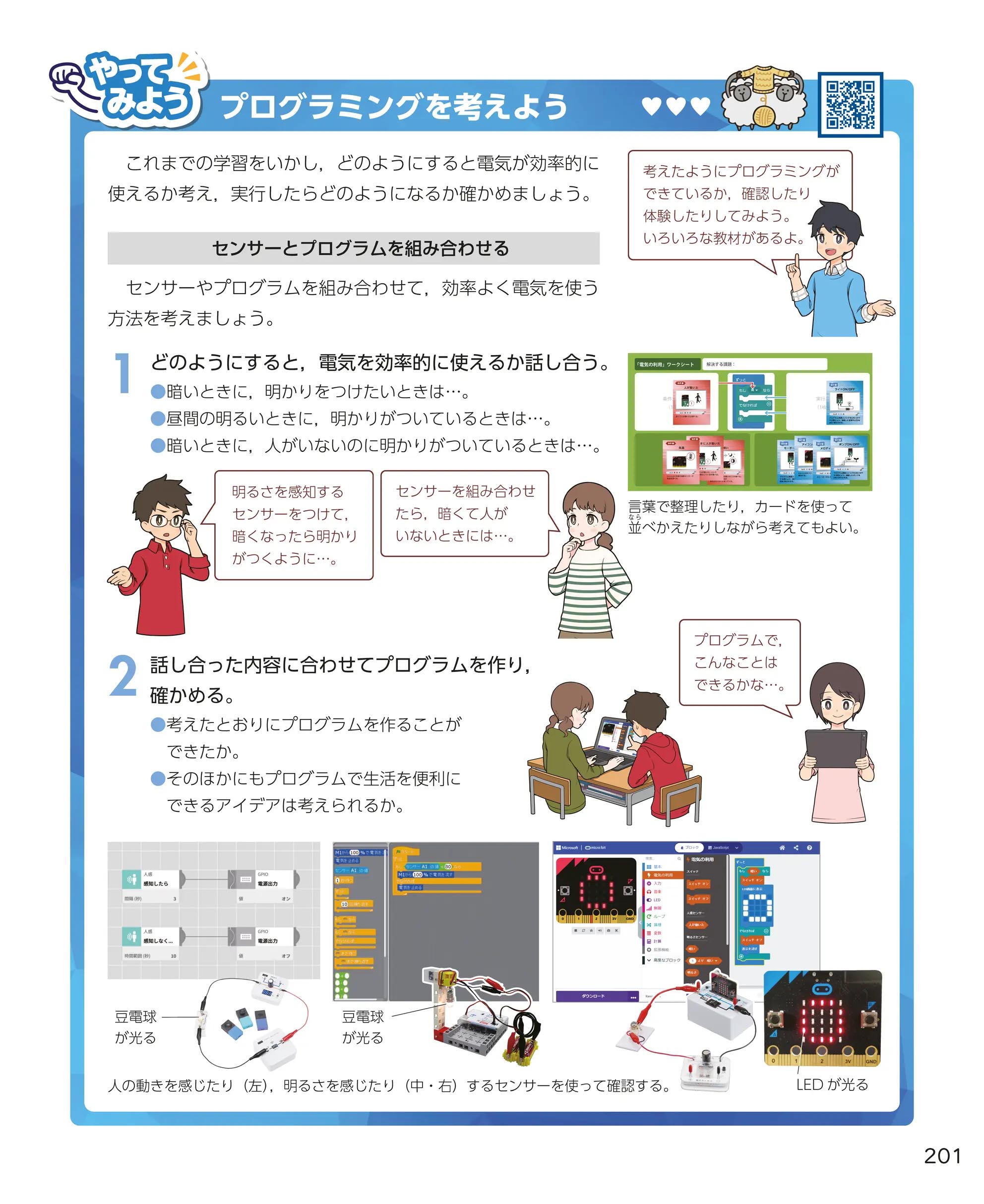 みんなと学ぶ小学校理科の教科書では、6年の「9 電気と私たちの生活」の単元で、主に下記のようなプログラミングを行う活動を設けております。